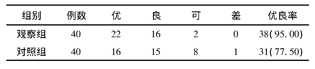 选取2016年1月—2017年1月河南中医药大学附属第一医院骨科收治的80例骨折患者作为研究对象。采用随机数字表法将80例患者分为观察组与对照组,对照组40例中男性25例,女性15例;年龄18~66岁,平均年龄(45.2±8.4)岁;其中四肢骨折22例,椎体骨折10例,骨盆骨折5例,其他3例。观察组40例中男性26例,女性14例;年龄18~61岁,平均年龄(46.1±9.0)岁;其中四肢骨折24例,椎体骨折10例,骨盆骨折5例,其他部位1例。2组患者基线资料比较无显着差异(P<0.05),具有可比性。