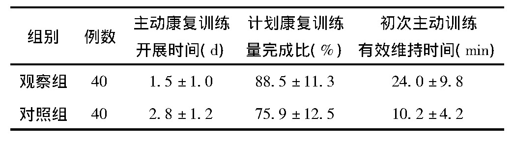 观察组主动康复训练开展时间、计划康复训练量完成比、初次主动训练有效维持时间均明显优于对照组,P<0.05,具有统计学意义。见表2。
