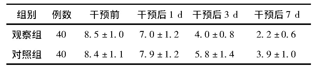 护理前2组疼痛视觉模拟评分(VAS)评分比较无显着差异(P<0.05),干预1、3、7 d后观察组VAS评分均明显低于对照组(P<0.05),差异具有统计学意义。见表1。
