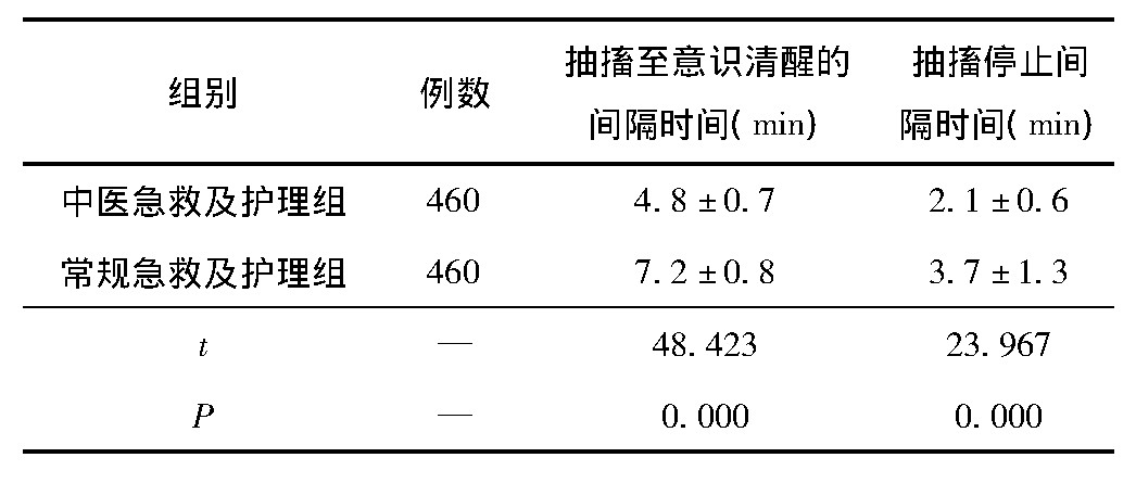 中医急救及护理组患儿的抽搐至意识清醒的间隔时间、抽搐停止间隔时间均要明显短于常规急救及护理组(P<0.05)。见表1。