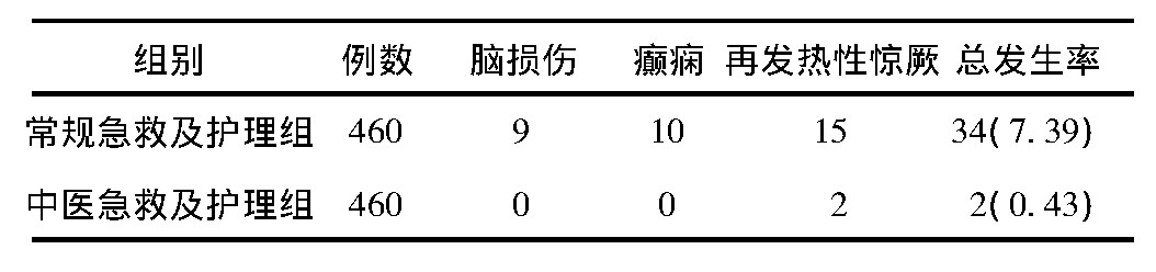 随机抽取2017年10月—12月于我院就诊的920例小儿热性惊厥患儿作为本次研究对象,随机把患儿分为常规急救及护理组和中医急救及护理组,2组患儿各460例。中医急救及护理组460例患儿中,女200例,男260例;年龄4个月至5岁,平均(2.6±0.9)岁;体温38.2~40.5℃,平均(39.2±0.2)℃。首次发病的小儿热性惊厥患儿有201例,再次发病的小儿热性惊厥患儿有259例。常规急救及护理组460例患儿中,女210例,男250例;年龄5个月至5岁,平均(2.8±0.9)岁;体温38.3~40.2℃,平均(39.3±0.2)℃。首次发病的小儿热性惊厥患儿有202例,再次发病的小儿热性惊厥患儿有258例。2组患儿基本资料相比差异无统计学意义(P<0.05)。