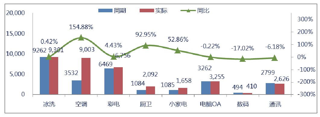 传统家电(冰洗、空调、彩电)综合贡献率在18%左右,4月份最低仅为14.49%,6月份最高达21.59%,经进一步分析,4月份因有大额工程机,工程机的综合贡献率较低,拉低了整体综合贡献率,5、6月份的综合贡献率变化,符合正常的促销节奏。
