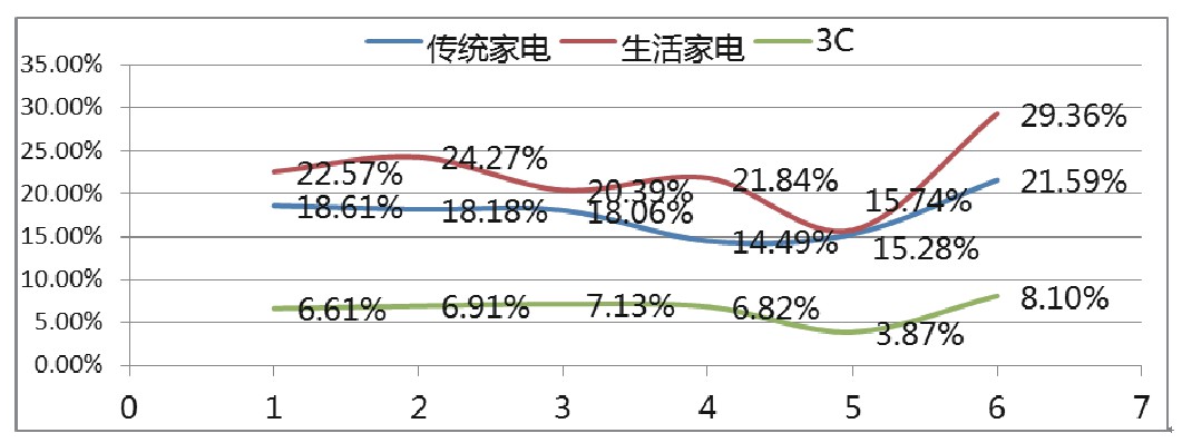 通过图2可以看出生活家电(厨卫、小家电)的综合贡献率在23%左右,在5月份最低仅为15.74%,6月份最高达到29.36%,5月份综合贡献率较低价原因是五一旺季,促销活动加大,拉低整体综合贡献率,在6月份时回收5月份投入资源,使综合贡献率达到了最高。