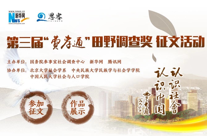 国务院参事室社会调查中心联合新华网、腾讯网共同发起第三届“费孝通田野调查奖”征文活动。现面向社会各界人士征集田野调查作品。