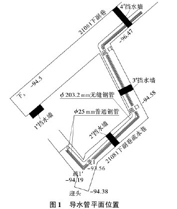为防止突水点转移到右侧采空区,在掘进工作面后方17 m处向左侧施工一条长度10 m的水平辅助巷道,然后向右侧转90°,与21081工作面下巷平行掘进,最终施工层位为L7-8灰岩。掘进12 m后,找出突水通道,用1根203.2 mm无缝钢管插入突水孔洞,深度约1.5 m,外端安装配套高压闸阀,上部用水泥砌实,将所有突水从导水管导出,高压闸阀保持常开状态。出水从引水管全部引出后,将辅助巷道和下巷迎头外23 m全部用料石填实后并进行注浆充填,保证两巷没有空隙。导水管平面位置如图1所示。【图1】