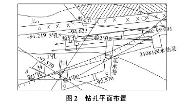 在21081下巷停掘位置向下33 m上帮开口做一个二1煤层及底板L8灰岩中钻场(如图2所示),在下巷钻场内先打1#放水孔,孔深70 m,涌水量最大120 m3/h,经疏放后稳定在100 m3/h左右;随后打3#放水孔,孔深63.8 m,水量最大达到30 m3/h,随后稳定在10 m3/h左右,2个钻孔终孔层位均在出水点下方L1-4灰内,使上部出水点的水压全部释放出来,并把上部出水点水量大部上从钻孔引出,以达到注浆条件。【图2】