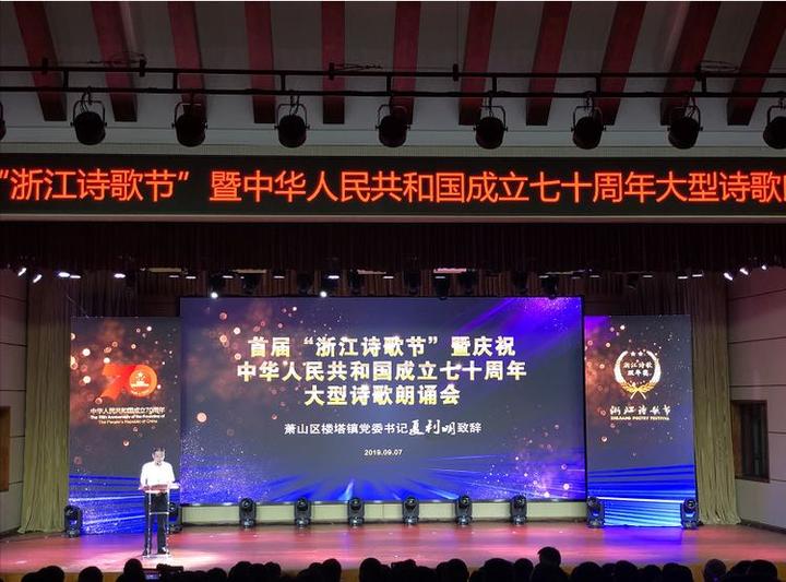 9月7日晚,由浙江省文联《品位.浙江诗人》杂志发起,中国作家协会《诗刊》社、《品位.浙江诗人》杂志社、杭州市作家协会联合主办,楼塔镇人民政府、萧山区作家协会、浙江诗人公众平台联合承办的首届"浙江诗歌节"暨庆祝中华人民共和国成立70周年诗歌朗诵会在浙江萧山楼塔镇盛大举行。