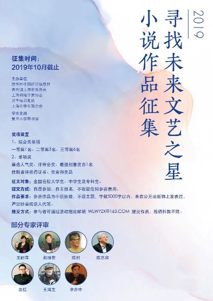 日前,2019寻找“未来文艺之星”小说征集活动正式启动。该活动旨在弘扬主旋律、传播正能量,为热爱文学的广大青少年搭建一个抒发梦想、实现梦想的平台。征文对象为全国在校中学生、大学生,自愿参加,自主报名,不收取任何费用。