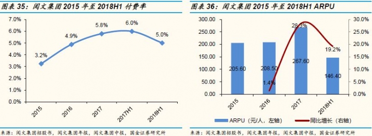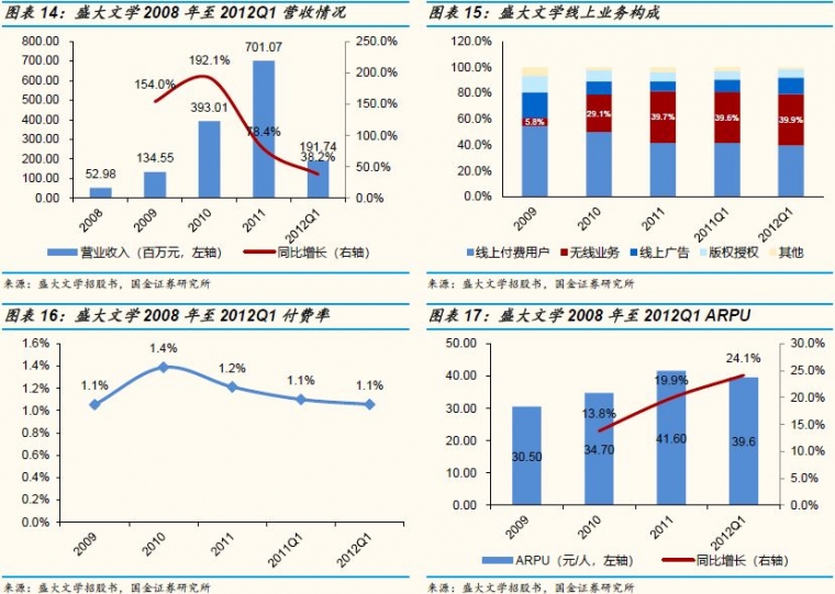 ①线上业务表现不俗,引入与第三方渠道合作的无线业务,乘移动流量红利,收入大幅提升。盛大文学2010年实现营收3.93亿元,同比增长192.1%。增长最快的是无线业务,当年带来0.6亿元收入,同比增长948.3%,无线业务占线上业务收入比重提升23.3个百分点。无线业务主要是与中国移动等第三方渠道商的合作,采取收入分成模式。公司自有平台的线上付费用户收入也高速提升,2010年贡献收入1.04亿元,同比增长91.3%,主要是并购带来的并表收入。2011-2012Q1收入增速逐渐放缓。在这个时期,盛大文学的付费率和ARPU仍处于较低水平,付费率仅1%左右,2012Q1的ARPU为39.6元/人。
