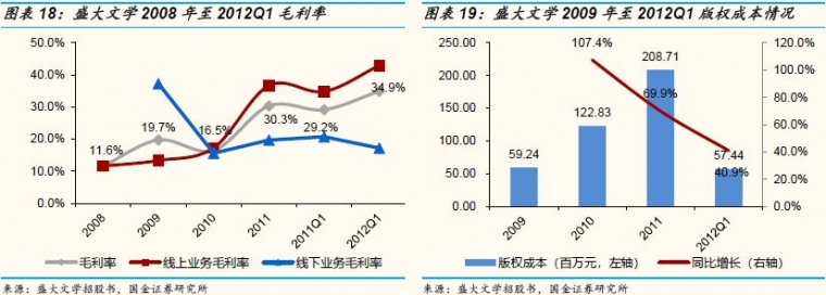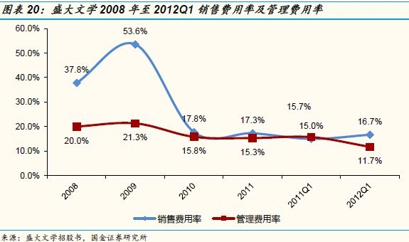 ②线上业务毛利率驱动整体毛利提升,2012Q1整体毛利率为34.9%,同比提升5.7个百分点。网络文学公司主营的线上业务是轻资产模式,成本的主要成分是付给作者的版权成本。随着作者基数扩大,新生作者对于平台依赖性提升,故而平台议价能力有所提升,分账比例往往会提高;并且无线业务是与第三方渠道的分成模式运营,也推动毛利率提升。但是如果长期依赖第三方渠道,毛利率提升也存在天花板,因为第三方的分账比例一般是固定的,长期下降空间有限。