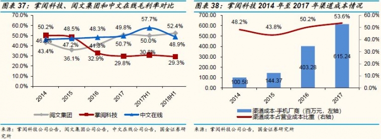 掌阅在渠道延展上倚重手机预装等推广方式流量优势较为稳固,但因让利手机厂商等渠道方,毛利率短期内预计不会大幅提升。掌阅科技在渠道方面与硬件终端厂商、手机应用商店、手机软件推广服务商合作,通过预装、展示广告位等方式推广掌阅APP,公司与渠道推广服务供应商进行分成,此类采购支出计入营业成本。掌阅科技的渠道成本占营业成本比重在2017年达53.6%, 2015年至2017年渠道成本一直上升,毛利率低于同行公司阅文、中文在线。