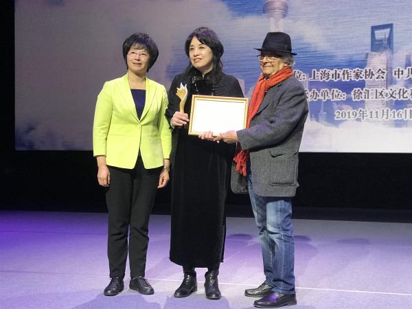 上海市副市长宗明(左)与叙利亚诗人阿多尼斯(右)为中国诗人翟永明颁奖