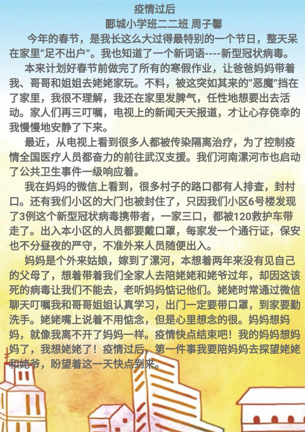 基本介绍:“盼——郾城小学抗疫情主题征文评比”优秀作文选。