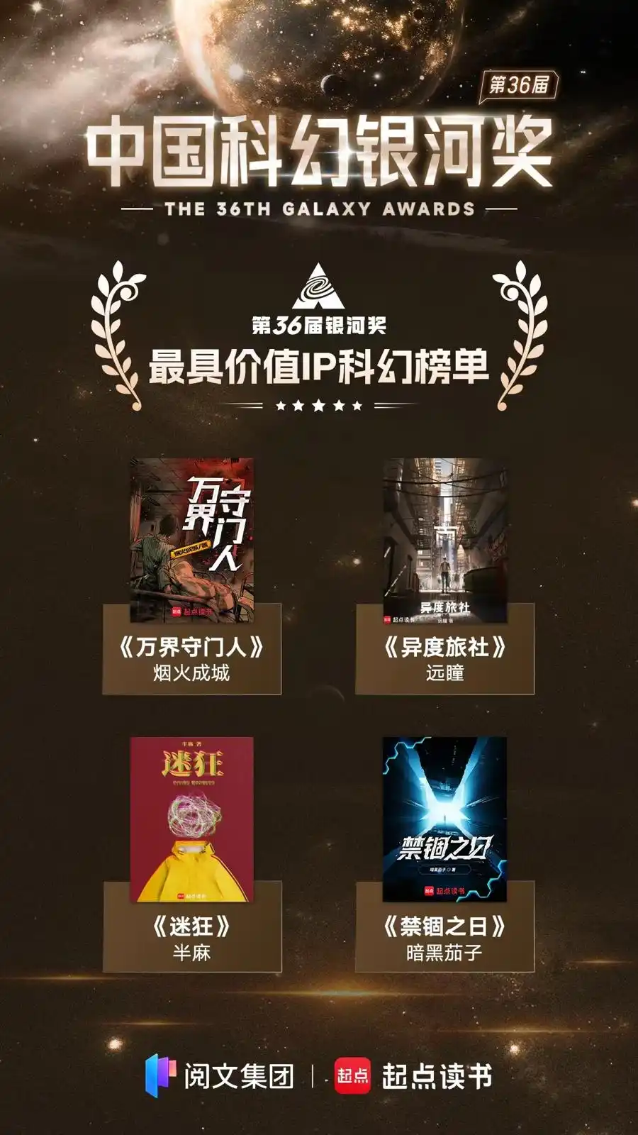 《为什么它永无止境》斩获最佳原创图书奖,它的作者柯遥42也成为首位获得银河奖的女频网文作家。今年的银河奖进一步强化网络文学比重,增设“最佳网络科幻作家奖”“最佳海外传播网络文学奖”,两大奖项分别由天瑞说符、《从红月开始》囊括,今年的“最佳新人奖”也不局限于实体出版,并最终由城城与蝉获得。此外,阅文旗下的《异度旅社》《万界守门人》《禁锢之日》《迷狂》等作品,入围了本届大会“最具IP价值榜单”。