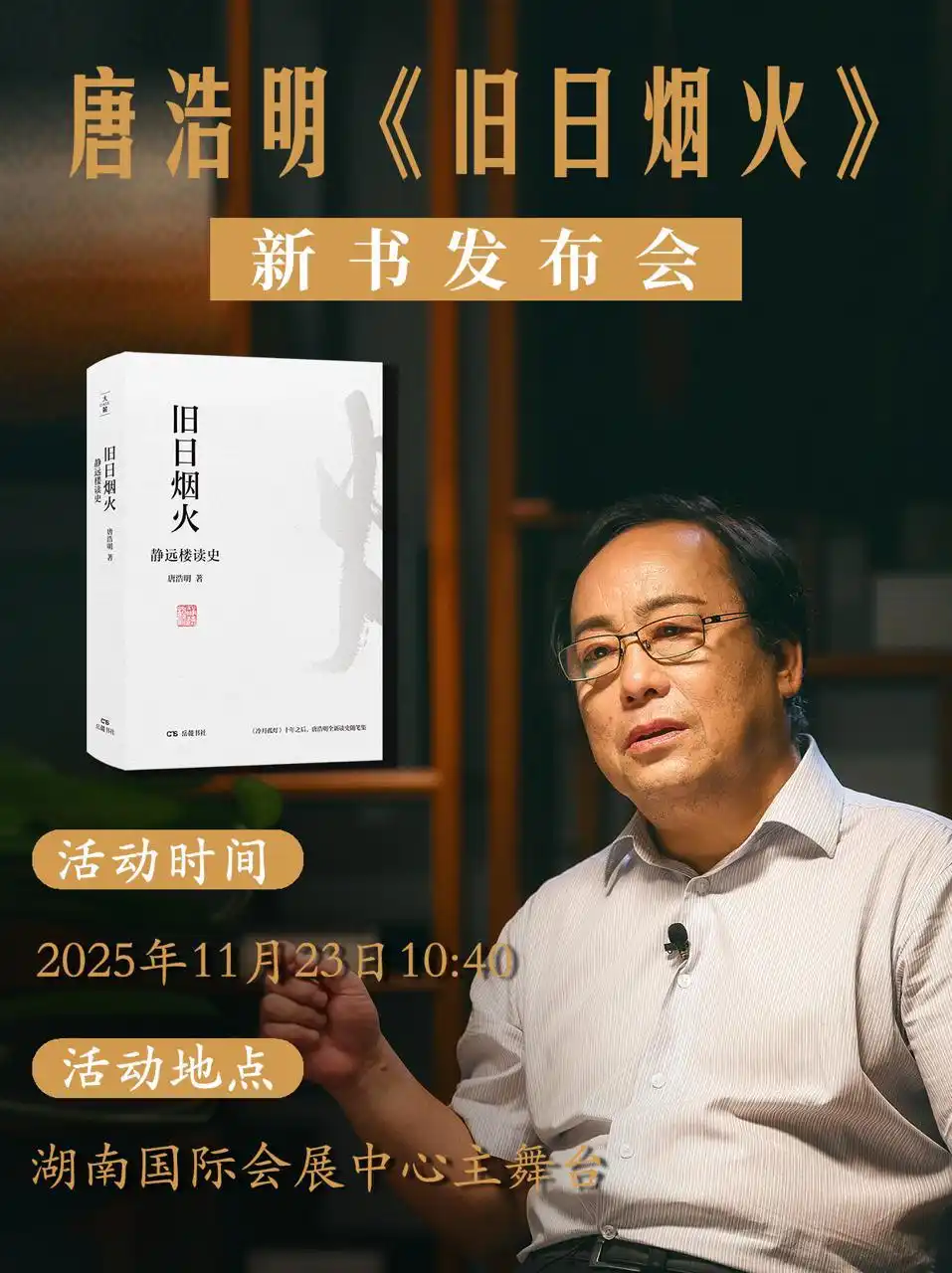 11月23日上午10:40,知名作家唐浩明将携新作《旧日烟火:静远楼读史》在湖南国际会展中心主舞台与读者见面,诚邀读者一同聆听历史回响,感受文化的力量。