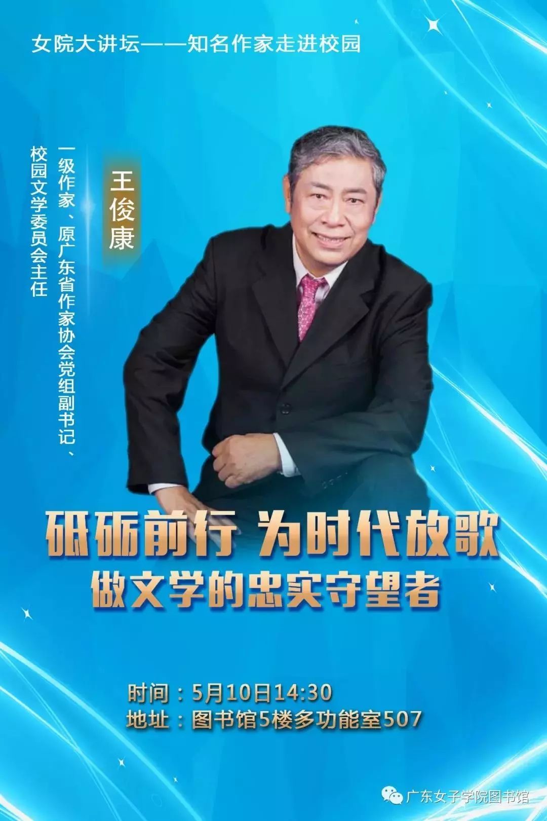 为了活跃校园文化,提升学生文学修养,响应“广东省作家协会文学进校园”专题活动,结合2018年读书节活动的安排,校团委和信息资源中心特邀请一级作家、原广东省作家协会党组副书记、校园文学委员会主任王俊康同志来我院讲座,届时王俊康同志将率领广东省作家协会部分着名作家莅临我校,欢迎老师、同学们到场聆听,与知名作家面对面沟通交流。