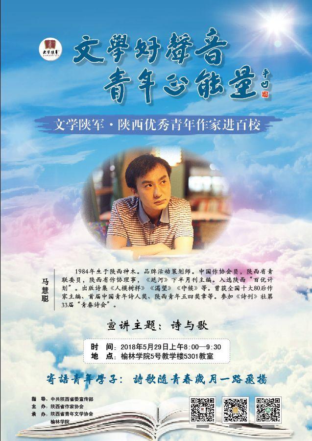 5月29日上午,青年作家马慧聪应邀走进榆林学院,为师生带来一场以“诗与歌”为题的精彩讲座。讲座由榆林学院文学院院长贺智利主持,文学院15级全体同学到场聆听。