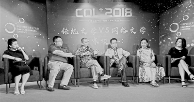 第二届中国“网络文学+”之“传统文学VS网络文学六家谈”8月12日在北京十月文学院举行,“传统”作家李敬泽(右三)、梁晓声(左三)、梁鸿(左一)与网络作家蒋胜男(右二)、董哲(左二)、红九(右一)围绕关涉网络文学的争议及现状与发展等相关问题,如文学的边界、文学理想等进行了对话和探讨
