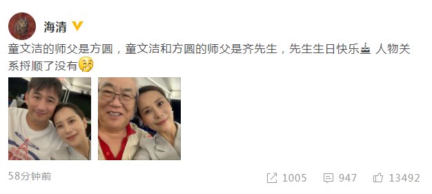 8月30日,海清发博为恩师庆生:“童文洁的师父是方圆,童文洁和方圆的师父是齐先生,先生生日快乐!人物关系捋顺了没有?”并配上了两张合照,一张是与黄磊的合照,另一张是与恩师齐先生的合照。