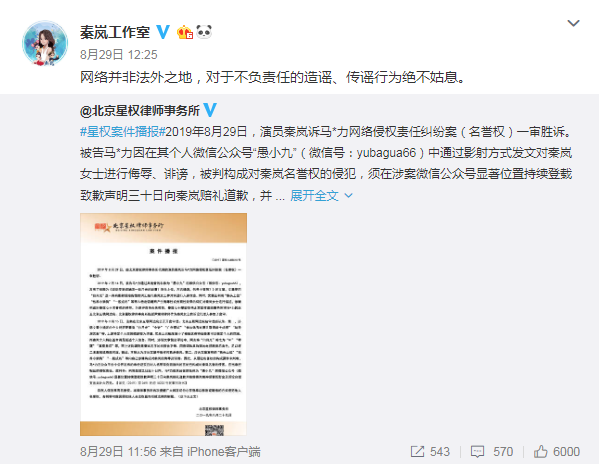 8月29日,演员秦岚名誉维权案胜诉,北京星权律师事务所对该案件进行播报。被告马*力曾通过在个人微信公众号以影射方式发文对秦岚女士进行侮辱、诽谤,被判构成对秦岚名誉权的侵犯,须在涉案微信公众号显著位置持续登载致歉声明三十日向秦岚赔礼道歉,并依法赔偿秦岚精神损害抚慰金及诉讼合理支出。