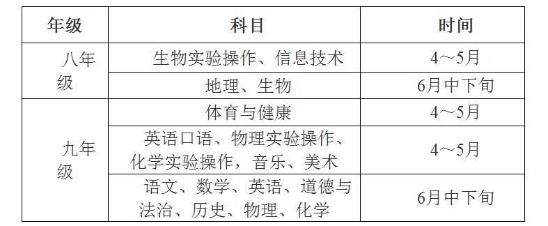 六、“2021年新中考方案”的考试时间安排。初中学生在校期间,各科学业水平考试只报考1次。各科目考试均安排在相应课程结束后进行,不得提前组织学生参加考试。省级统考科目安排在每年6月中下旬,具体考试时间、时长和科目顺序由省教育考试院另行通知。我市或县(市)区教育局、学校组织的测试科目,安排在4~5月份进行,各科目分年级考试时间安排如下: