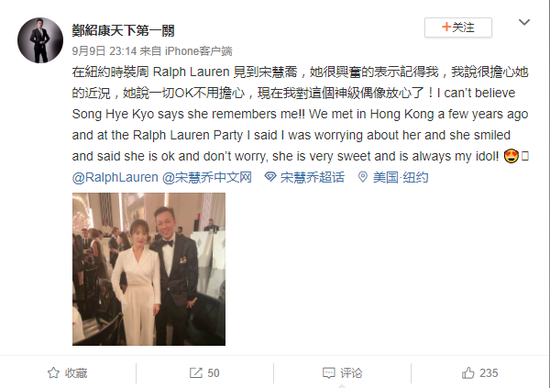 昨日,香港著名公关郑绍康在微博晒出与宋慧乔在纽约时装周的合影,表示对方是他的偶像,而最近又在时装周见到了偶像。