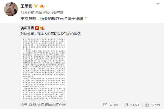 9月10日,王思聪转发动态力挺彭昱畅:“支持彭彭,恒业的操作已经属于诈骗了”。