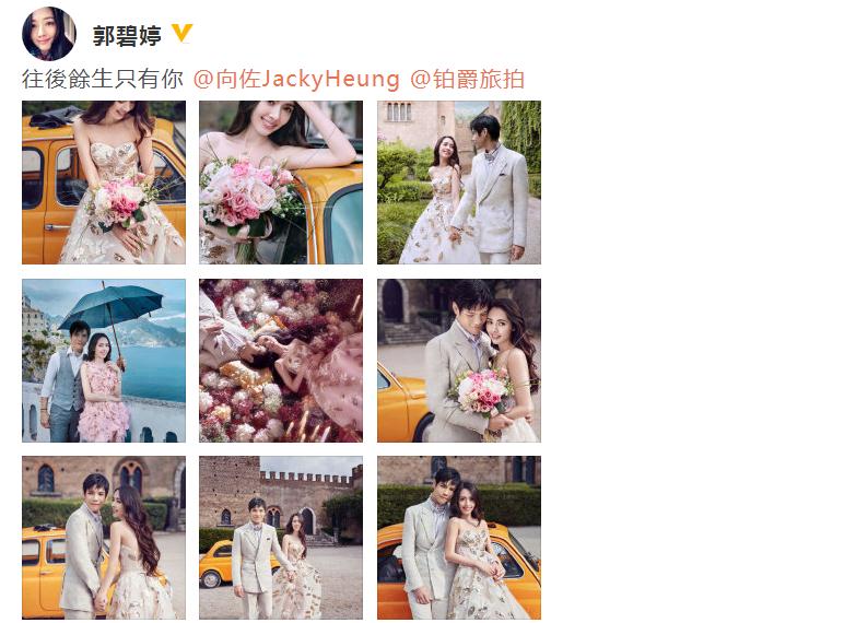 9月12日早,被曝已完婚的向佐[微博]和郭碧婷[微博]在微博上发布一组甜蜜婚纱照,并真情表白对方:“往后余生只要你。”“往后余生只有你。”照片中,郭碧婷身穿多套婚纱美如天仙,向佐西装革履深情款款,两人甜蜜依偎幸福爆表。