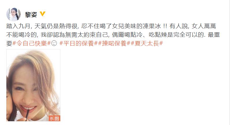9月11日晚,黎姿[微博]通过微博晒和女儿的合照,并配文写道:“踏入九月,天气仍是热得很,忍不住喝了女儿美味的冻果冰!有人说,女人万万不能喝冷的,我却认为无需太约束自己,偶尔喝点冷、吃点辣是完全可以的。最重要令自己快乐!”