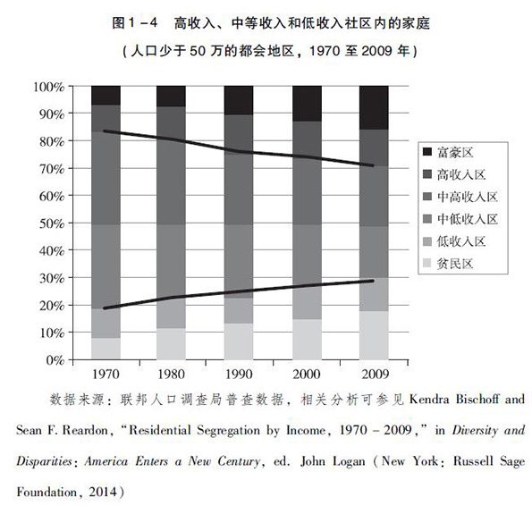 而同时,破碎的理想背后,是逐渐分裂为两个美国的残酷现实。这一点最直观地体现在了美国人的居住模式上。正如图中所示,越来越多的家庭住在清一色的富人社区或穷人社区,而住在贫富杂居或中产社区的美国人越来越少,这体现的正是日益森严的阶级壁垒。而美国穷人街区的危险程度,也是我们完全无法想象的,这一点帕特南在书中也有仔细讲。