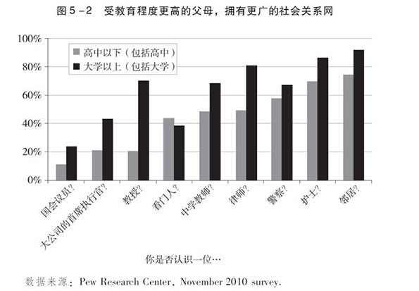 帕特南是研究社会资本的大师,他在书中提到,弱关系对一个孩子的成长尤为重要。所谓弱关系,是指孩子的父母是否有朋友的朋友,能够在孩子找工作、申请大学或生病就医问题上随时施以援手。从这张图中可以看到,受教育程度更高的父母,拥有更广的社会关系网;而受教育程度较低的父母,他们的孩子的社交圈就很难超出亲戚与邻居的范围,在诸多社会职业中,较之于高知家长,他们认识多一些的只有“门卫”。