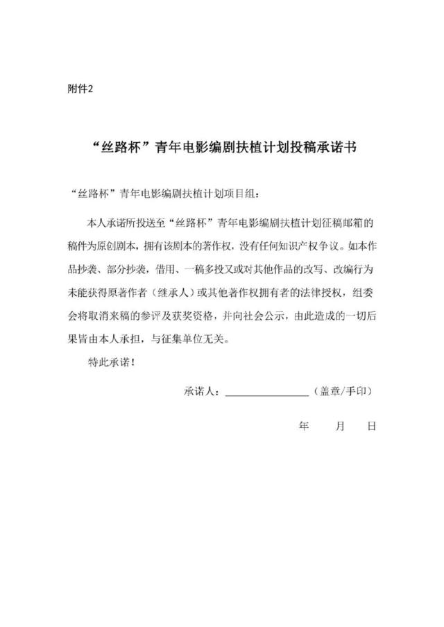 4.作者本人签署的原创性承诺书(需本人签字后拍照或扫描,并将电子版与剧本和报名表一同发送至收稿邮箱中)。