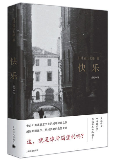 《快乐》是日本新锐女作家青山七惠完成于2013年的长篇小说,最初刊载于日本《群像》杂志,紧接着由讲谈社出版了单行本和文库本。今年6月,上海译文出版社引进出版了简体中文版,由岳远坤翻译的《快乐》通篇都充满了或明或暗的欲望。日文版的腰封上写着:“疯狂的爱、中毒的欲望、燃烧不尽的孤独”,这是一篇“以鲜烈笔致描写的官能心理小说”。欲望,在慎司身上表现为设法让妻子出轨的畸形性欲;在德史那里是无底洞般的贪婪食欲;在耀子内心是重返十九岁狂乱之夜的渴求;在芙
