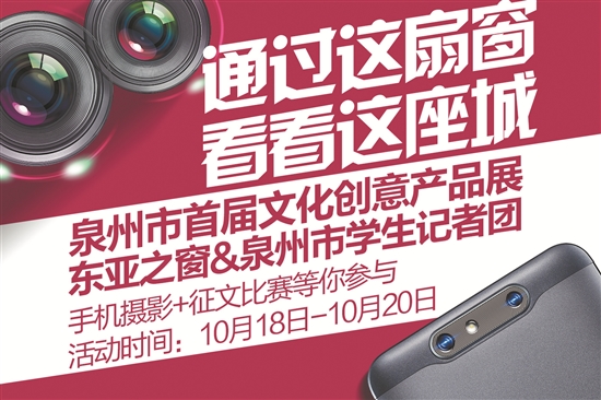 在此期间,泉州东亚之窗文创园与泉州市学生记者团联合举办的“通过这扇窗,看看这座城”主题手机摄影和征文比赛将同步开展。届时将邀请数百名学生记者逛文创盛会,用图片、文字的形式,记录本次活动。