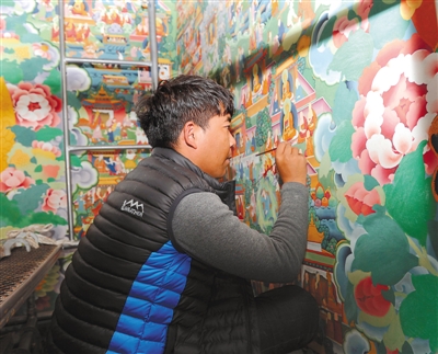 维修壁画工作人员对阿里地区普兰县科迦寺的壁画进行修复