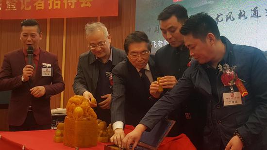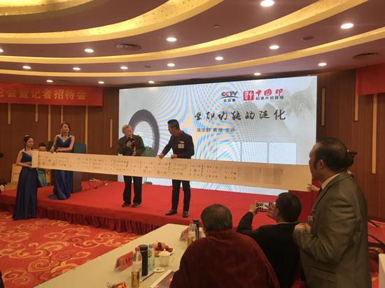 《合肥晚报》老报人潘立纲先生现场展示了他收藏的33米印章长卷,上面计有99个著名书画名家的1420方印章。据悉,该部纪录片将全面展示中国玺印的历史文化内涵。