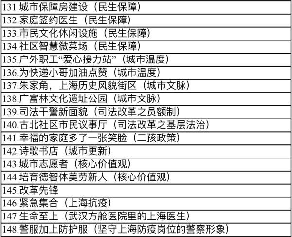 选题以中国共产党发展史以及上海城市建设史上重要的人物、事件、现象等为切入点,全面展现建党百年、新中国成立70周年以来上海城市发展轨迹以及人民群众生活改善的景象,重点聚焦十八大以来上海社会经济发展取得的卓越成就。作者可选取主办方所拟的148项《推荐选题》(文末附)进行创作,也可自选选题进行创作。