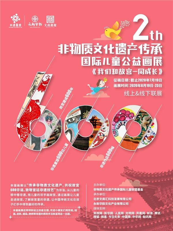 2020年是故宫成立600华诞,为共祝这一文化盛事,由非物质文化遗产传承国际儿童联盟基金(简称“非遗童盟”)主办,永新华韵文化产业有限公司、北京文商汇科技发展有限公司承办,中国中小商业企业协会国际合作部、文商书馆、乾元书院艺术培训中心、支点网校、加拿大大爱文化基金会、北京多向度文化传媒有限公司、北京森冠文化发展有限公司、天津天资文化传播有限公司、北京大师小匠文化有限公司、女书(北京)国际文化交流中心、北京万方程科技有限公司、佳鹰妈妈社群、行学天下、北京善道文化促进会、北京酷谷文化传播有限公司、运河瓷画艺术馆、希望美术等多家机构协办的,2020年第二届非物质文化遗产传承国际儿童公益画展--《我们和故宫一同成长》将于2020年8月19日至23日在北京开展,本次画展为线上+线下联合展览,儿童作者的美术作品将在线上线下同步展出。