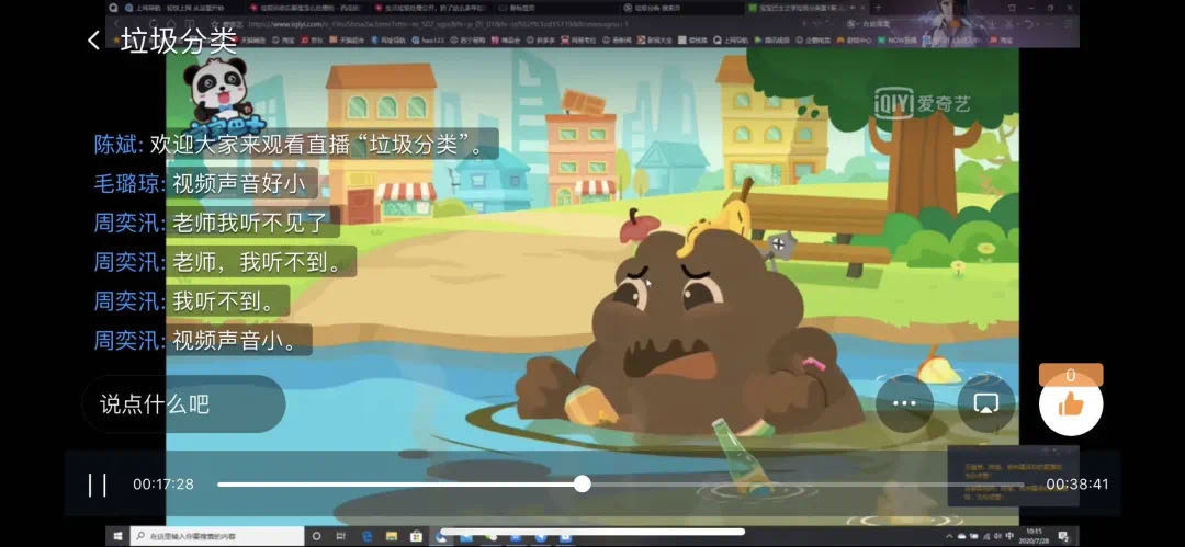 第一节课由志愿者陈斌和周立雯同学一起开展垃圾分类直播课,这次课主要是给小朋友们看垃圾分类的视频,让小朋友们懂得生活中会产生太多太多的废品,但是这些堆积如山的废品,却没能得到妥善的安排,掩埋、焚烧,这些都不是能将它们的危害化为最小的办法,终归最后伤及的也是我们的环境。