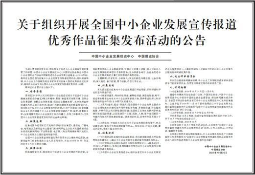 为深入贯彻落实党中央、国务院关于促进中小企业健康发展的重要工作部署,中国中小企业发展促进中心、中国报业协会联合中国中小企业国际合作协会和同景促进中小企业发展公益基金,从2020年起,每年在全国范围内征集中小企业发展宣传报道优秀作品,组织媒体领域、中小企业工作领域的知名专家学者对征集入围的优秀作品进行评审,每年向全社会发布全国中小企业发展宣传报道优秀作品100篇。