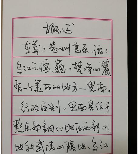 安元昌怀着对思南这片充满生机活力的沃土的挚爱,以田永红先生编著的《思南文化辞典》为蓝本,以硬笔书法的形式创作《手写的思南》,向读者介绍思南的发展历程、思南悠久的厚重的历史文化、区位优势、风土人情、自然资源、文化旅游资源。读者在品尝硬笔书法韵味的同时,更好的了解思南,认识思南。