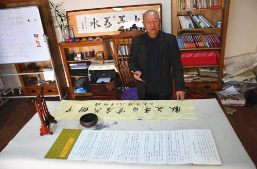 黑龙江省科技厅退休老党员付俊来决心从建党95周年开始,用5年时间,选择我党100年的历史文献、书写100万字内容、装裱100卷文钞,在我党建党100年庆典之际,向党中央献礼。
