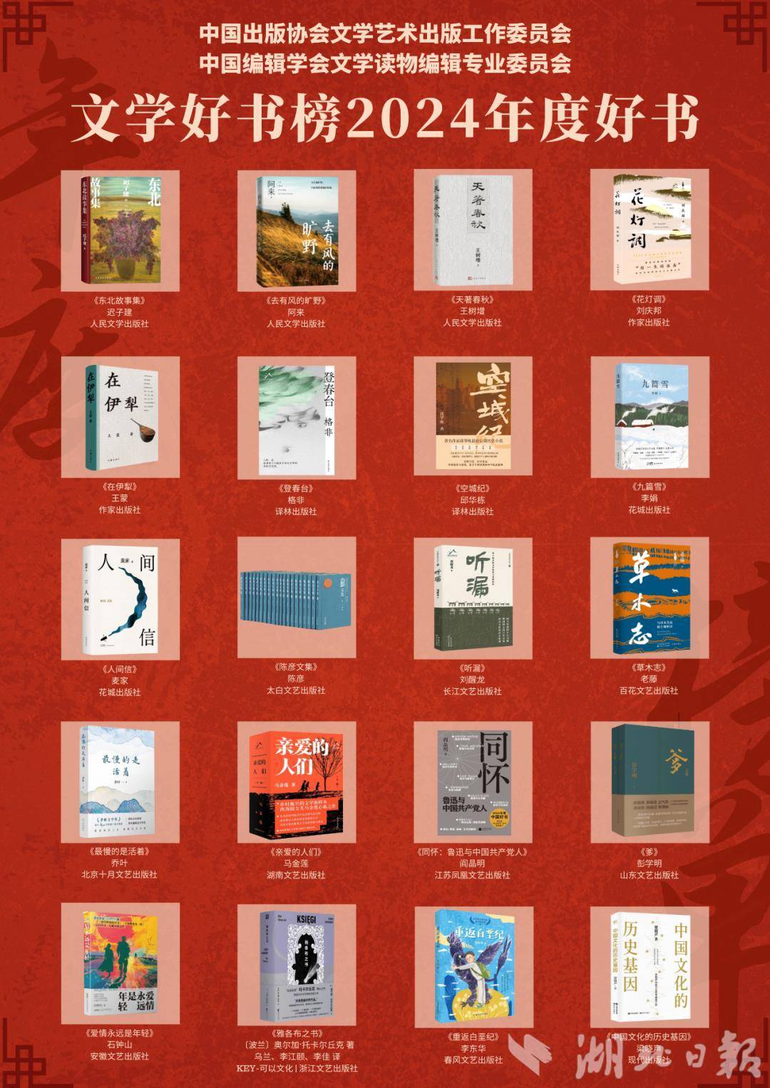 2024年度好书由全国文艺出版社报送,经各社社长或总编辑投票、网络票选、专家终评三个环节,一共评选出20部2024年度好书。这20部好书均出自全国文学名家之手,分别是《东北故事集》(作者:迟子建)、《去有风的旷野》(作者:阿来)、《天著春秋》(作者:王树增)、《花灯调》(作者:刘庆邦)、《在伊犁》(作者:王蒙)、《登春台》(作者:格非)、《空城纪》(作者:邱华栋)、《九篇雪》(作者:李娟)、《人间信》(作者:麦家)、《陈彦文集》(作者:陈彦)、《听漏》(作者:刘醒龙)、《草木志》(作者:老藤)、《最慢的是活着》(作者:乔叶)、《亲爱的人们》(作者:马金莲)、《同怀:鲁迅与中国共产党人》(作者:闫晶明)、《爹》(作者:彭学明)、《爱情永远是年轻》(作者:石钟山)、《雅各布之书》(作者:[波兰]奥尔加·托卡尔丘克,译者:乌兰 、李江颐、李佳)、《重返白垩纪》(作者:李东华)和《中国文化的历史基因》(作者:梁晓声)。