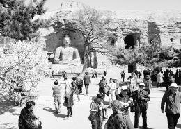 5月1日,游客在大同云冈石窟享受惬意的塞上风光。大同市围绕“增加游客、增加收入、增加美誉度”三大目标,推动文化旅游产业发展,取得了丰硕成果。(记者 刘通 )