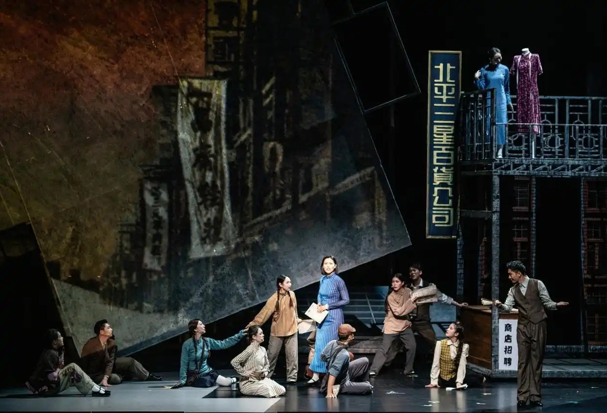 值得一提的是,该剧的舞美设计也极具现代感。舞台以“人生十字路口的选择”为创意核心,着重突出空间纵深感,将建筑形象以“倒映”“镜像”“悬浮”等造型方式运用于舞台之上,重现当年那个颠倒黑白的世界和破碎的家国。舞台上,多时空的交错、多空间的平行蒙太奇也时常出现,作为戏剧语言完成对角色的打造和剧情的陈述。多媒体设计则将舞台局部放大,营造视觉美感,通过色彩夸张强化人物内心。