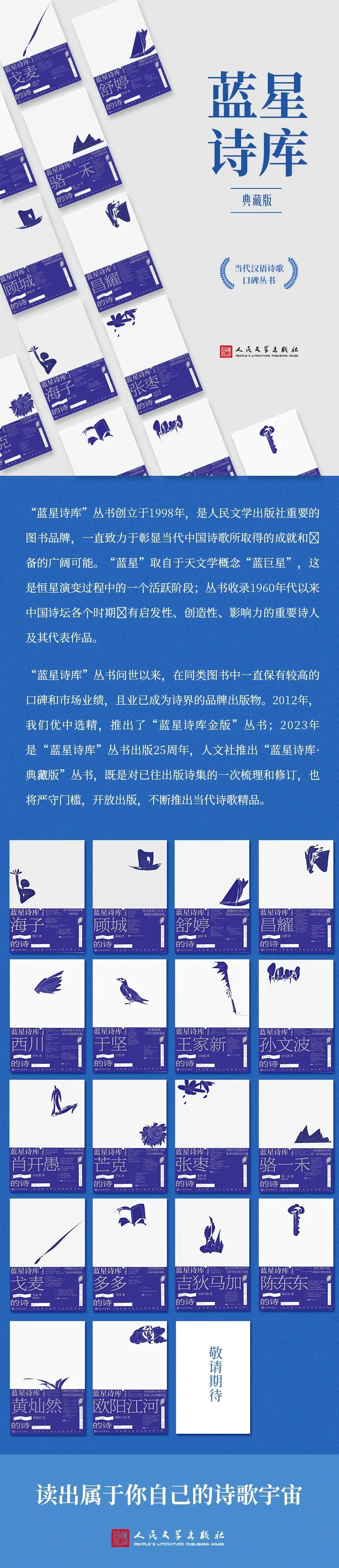 新诗百年,现代汉语诗歌的面貌已经焕然一新。自1998年起,人民文学出版社推出“蓝星诗库”丛书,致力于彰显当代中国诗歌所取得的成就和具备的广阔可能。“蓝星”取自于天文学概念“蓝巨星”,这是恒星演变过程中的一个活跃阶段;丛书收录1960年代以来中国诗坛各个时期具有启发性、创造性、影响力的重要诗人及其代表作品。