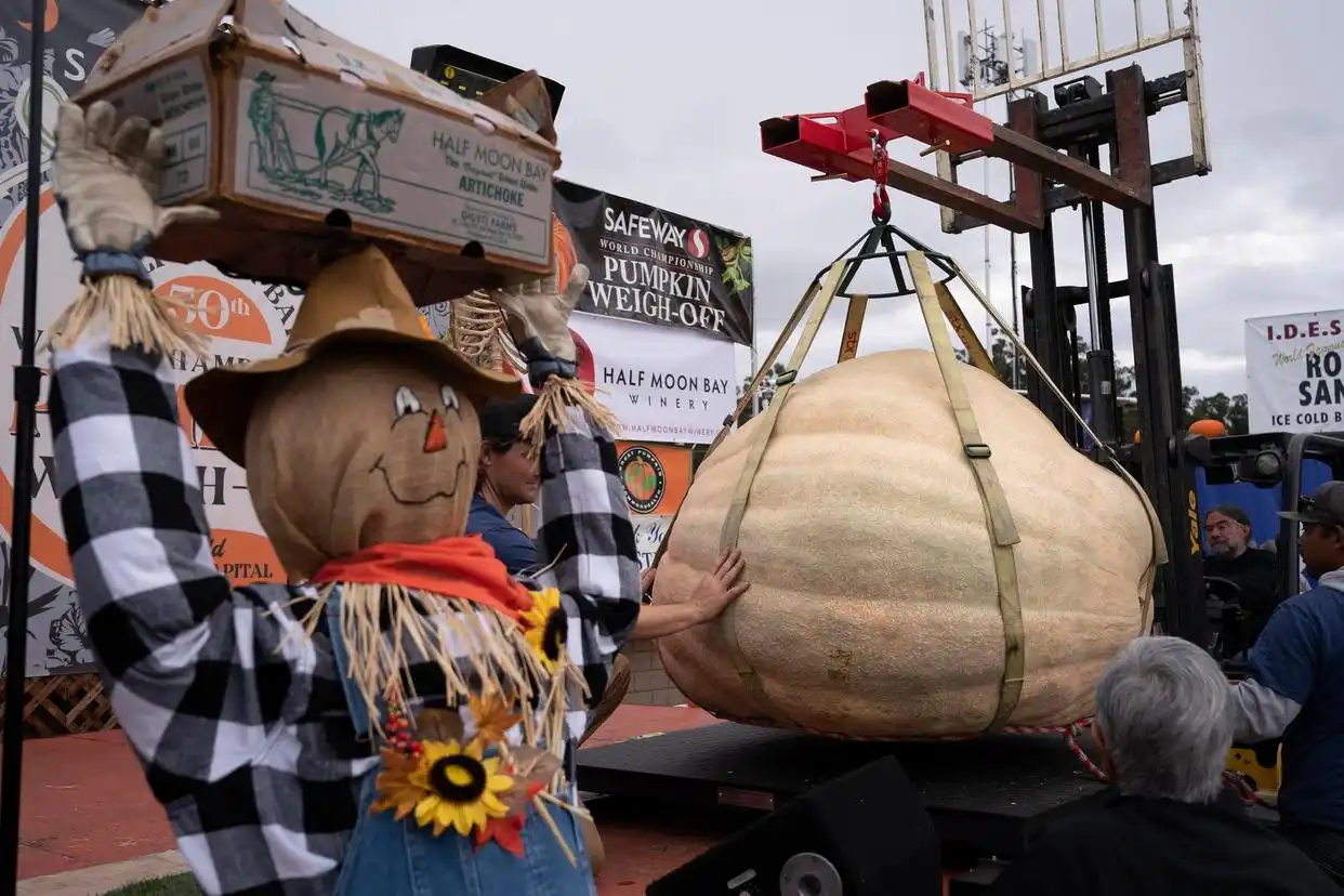 这是2023年10月9日在美国加利福尼亚州圣马特奥县半月湾拍摄的南瓜大赛称重现场。新华社发(李建国摄) 去年比赛中击败道森获得冠军的是美国明尼苏达州园艺教师特拉维斯·京格,他种的南瓜重1121公斤。今年,京格种的南瓜受损,因而没有参加比赛。