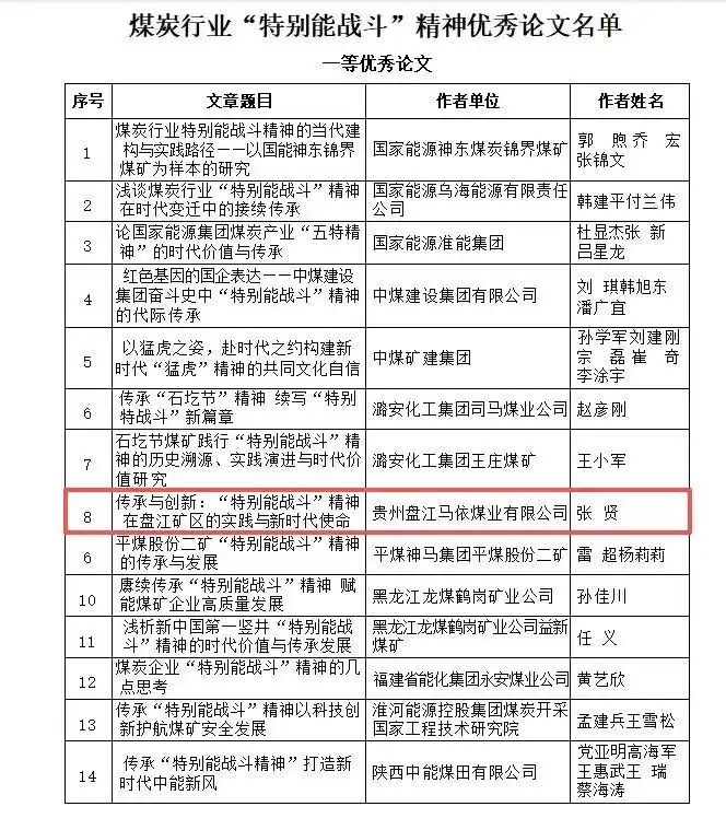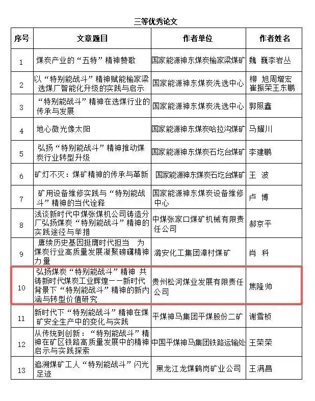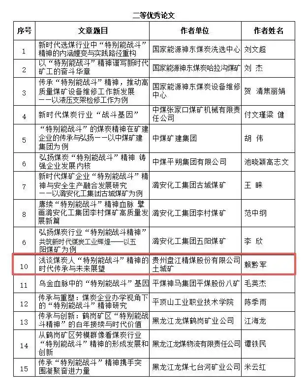 其中,马依公司张贤撰写的《传承与创新:“特别能战斗”精神在盘江矿区的实践与新时代使命》获一等奖;土城矿赖黔军的《浅谈煤炭人“特别能战斗”精神的时代传承与未来展望》获二等奖;松河公司焦隆帅的《弘扬煤炭“特别能战斗”精神 共铸新时代煤炭工业辉煌——新时代背景下“特别能战斗”精神的新内涵与转型价值研究》获三等奖。