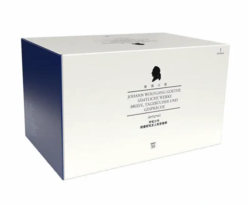 从外观来看,这套书籍采用了典雅的蓝白配色方案,左侧常配有歌德的剪影或肖像画,右侧则留白处理,形成强烈的视觉平衡感。书脊清晰标注德文书名,既尊重原著风貌,又提升了整体的收藏质感。包装盒同样延续简洁风格,印有统一的系列标识,适合陈列于书架之上。每一册封面都带有卷号提示,方便查找与归类。这种注重细节的设计理念,反映出出版方对文学经典的敬畏之心,也让整套书成为书房中的一道人文风景线。