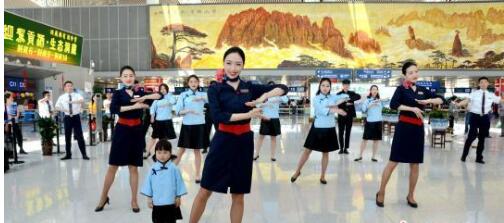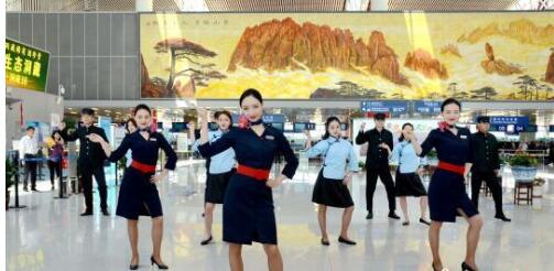 当日中午,合肥新桥国际机场候机楼东航柜台前,音乐突然响起,一群身着中山装的十几位男女青年齐刷刷出现在候机楼大厅,并随着音乐的节拍跳起了律动的舞蹈,顿时吸引了大量游客驻足观赏、拍照。舞蹈结束,东航安徽分公司的乘务员和地服人员还开展了志愿服务,协助旅客办理值机,提供乘机讲解服务。